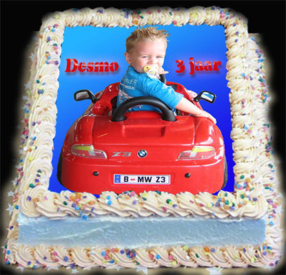Ook de verjaardagstaart kan met hetzelfde ontwerp bedrukt worden, vraag de bakker om meer informatie of bestel